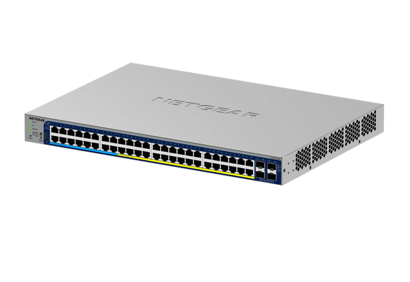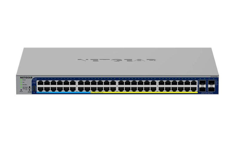 NETGEAR GS752TXUP. Switch type: Managed. Basic switching RJ-45 Ethernet ports type: Gigabit Ethernet (10/100/1000), Basic switching RJ-45 Ethernet ports quantity: 48. MAC address table: 16000 entries, Switching capacity: 176 Gbit/s. Networking standards: IEEE 802.1D, IEEE 802.1Q, IEEE 802.1p, IEEE 802.1s, IEEE 802.1w, IEEE 802.1x, IEEE 802.3, IEEE.... Power over Ethernet (PoE). Rack mounting, Form factor: 1U