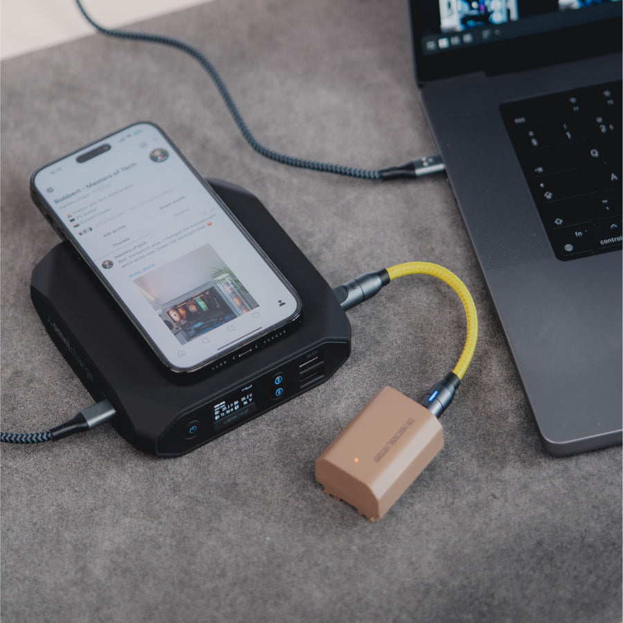 Omnicharge 20C+. Battery capacity: 25600 mAh, Battery technology: Lithium-Ion (Li-Ion), Fast charging technology: Quick Charge 3.0, Battery voltage: 20 V. USB Type-A output ports: 2, USB Type-C ports quantity: 2. Wireless charging. Total output power: 60 W, Output current: 3 A. Product colour: Black